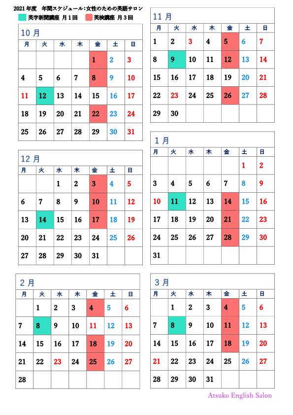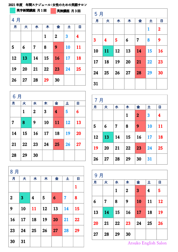 女性のための英語サロン:年間スケジュール